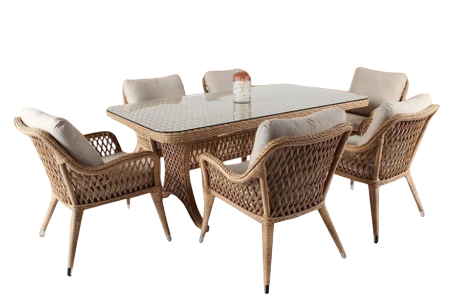 Masa takımımız 1 adet masa ve 6 adet sandalyeden ibarettir. Görselde yer alan aksesuarlar ürün içeriğine dahil değildir. Kumaşlarımız su itici özelliğe sahip dış mekan kumaşlarıdır. Ürünümüz yüksek kalite Wintech sentetik örgüden imal edilmiş ve profili alüminyumdur.