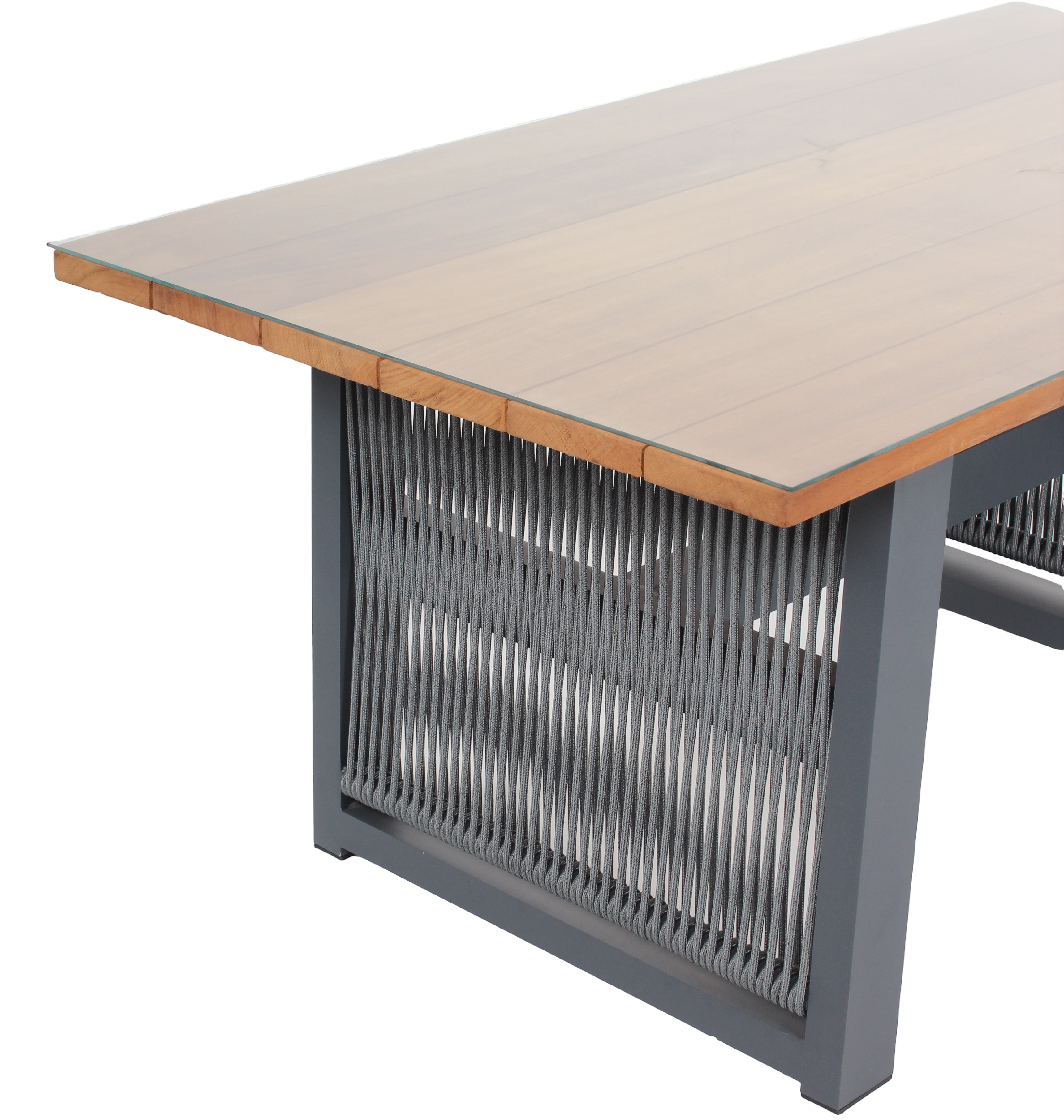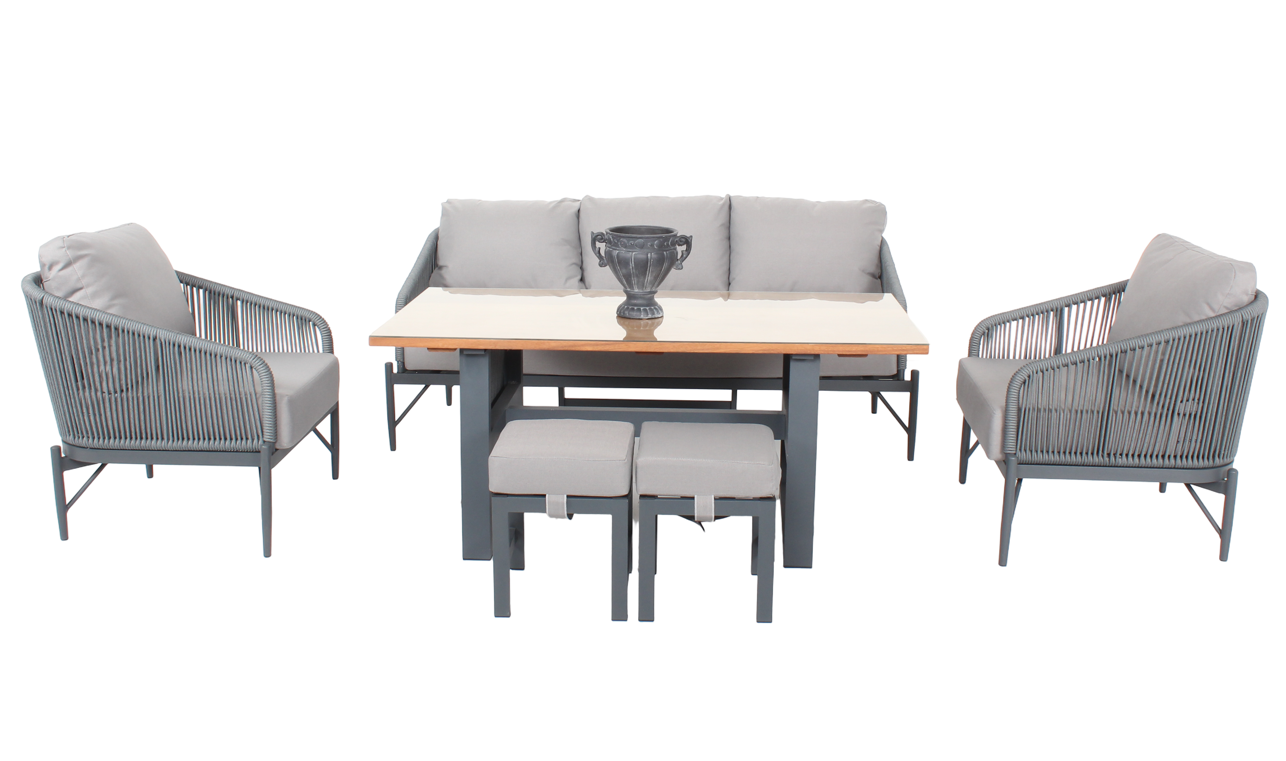 Oturma takımımız 1 adet üçlü koltuk 2 adet tekli koltuk 1 adet orta sehpa ve 2 adet puftan ibarettir. Görselde yer alan aksesuarlar ürün içeriğine dahil değildir. Kumaşlarımız su itici özelliğe sahip dış mekan kumaşlarıdır. Ürünümüzün profili alüminyumdur. Dış mekan iplerden imal edilmiş olup sehpa tablasında tüm hava koşullarına dayanıklı iroko malzeme kullanılmıştır.