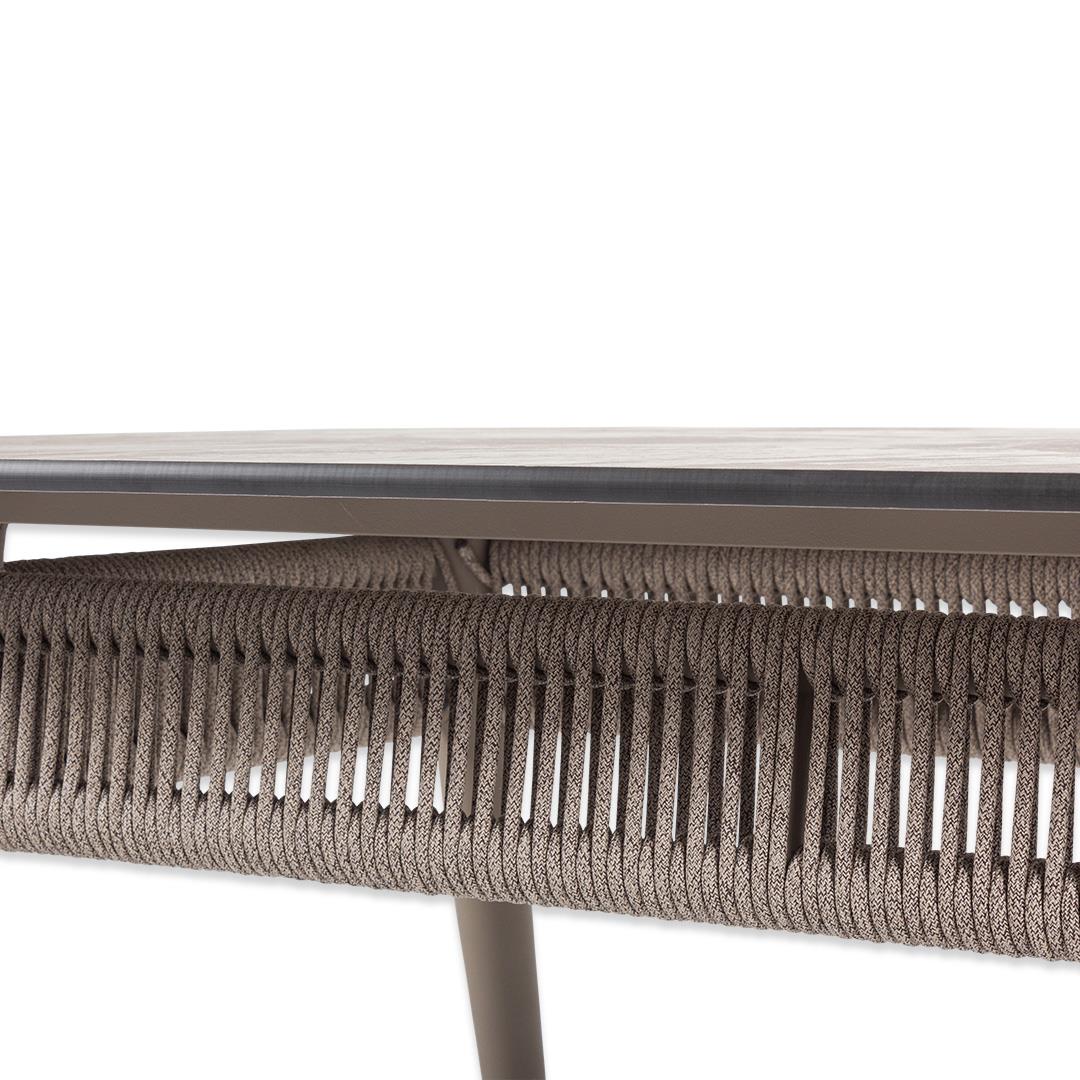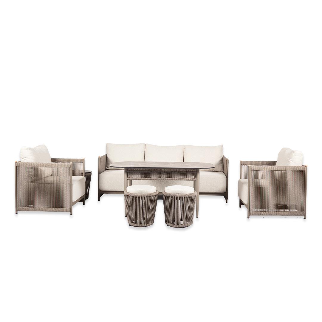 Oturma takımımız 1 adet üçlü koltuk 2 adet tekli koltuk 1 adet orta sehpadan ve 2 adet puftan ibarettir. Görselde yer alan aksesuarlar ürün içeriğine dahil değildir. Kumaşlarımız su itici özelliğe sahip dış mekan kumaşlarıdır. Ürünümüzün profili alüminyumdur. Dış mekan iplerden imal edilmiş olup sehpa tablasında tüm hava koşullarına dayanıklı compact malzeme kullanılmıştır.