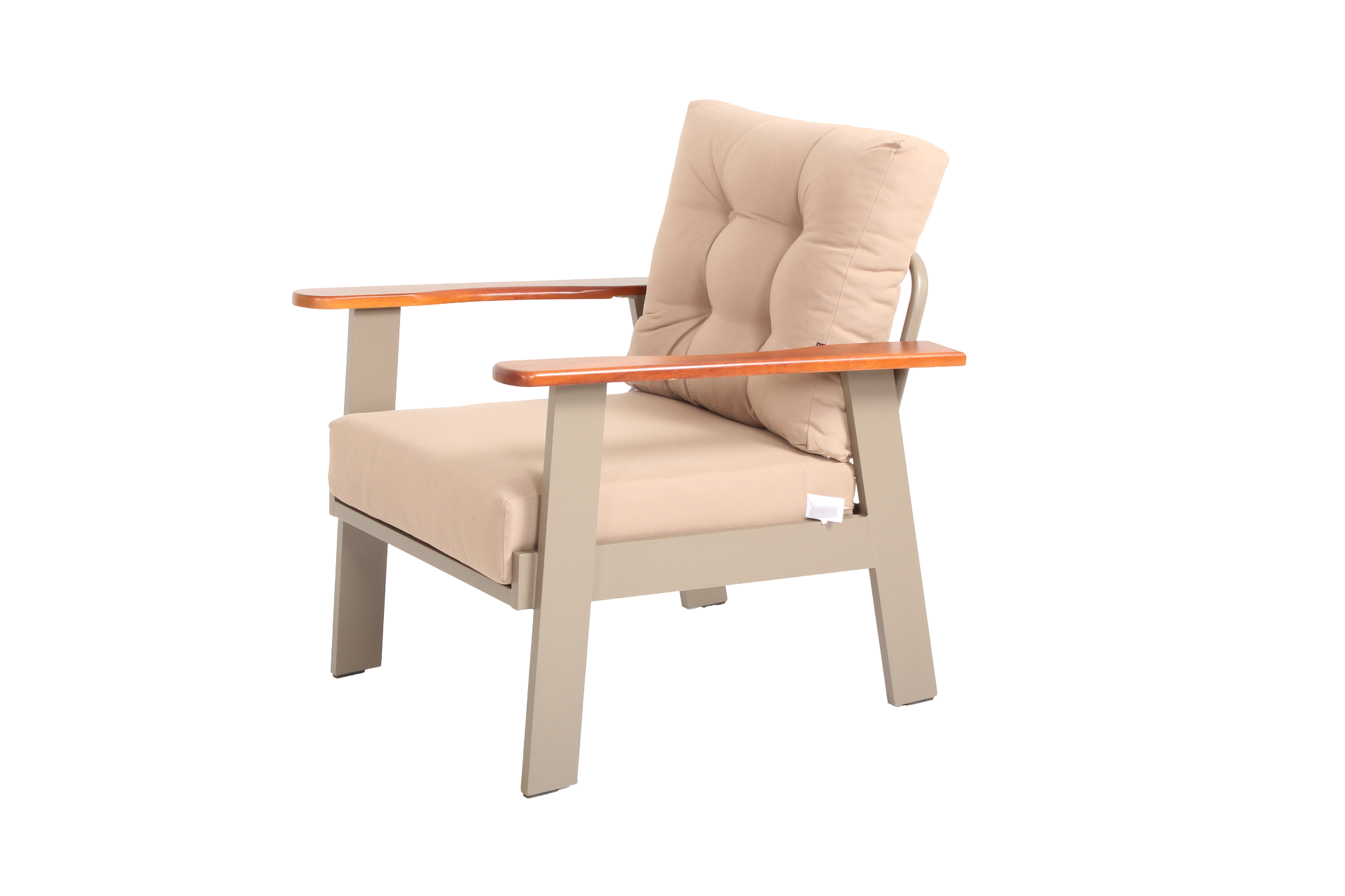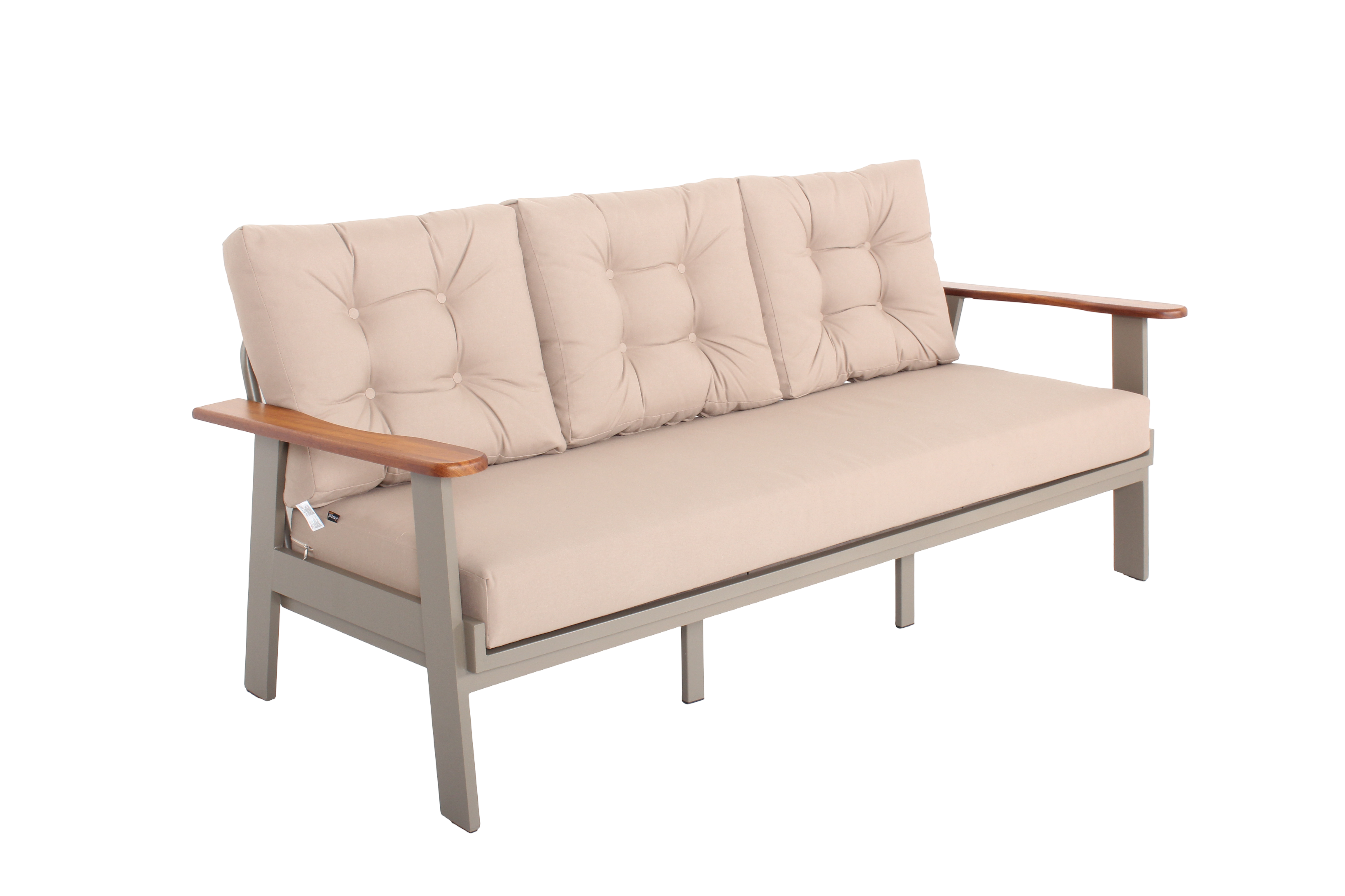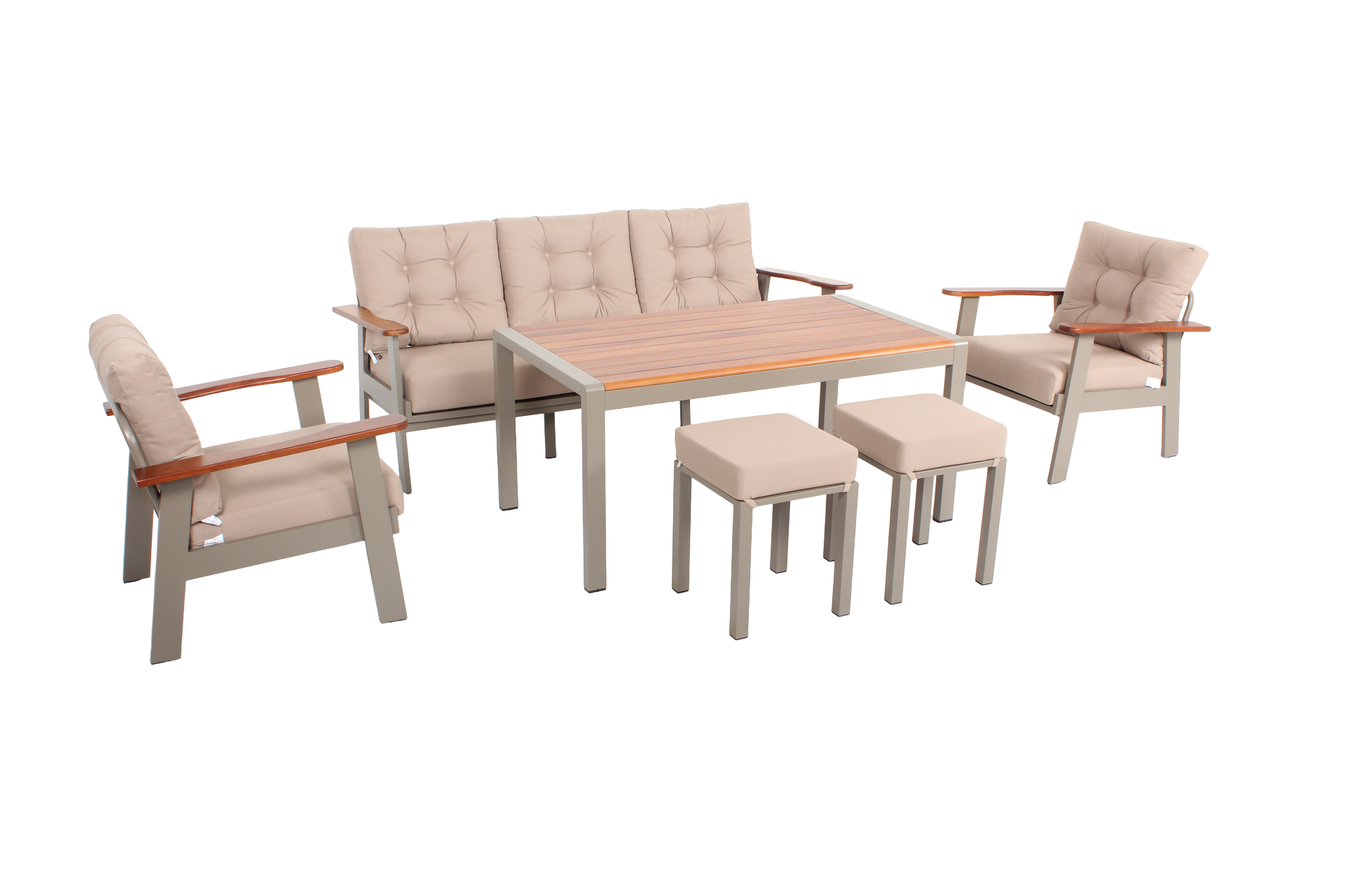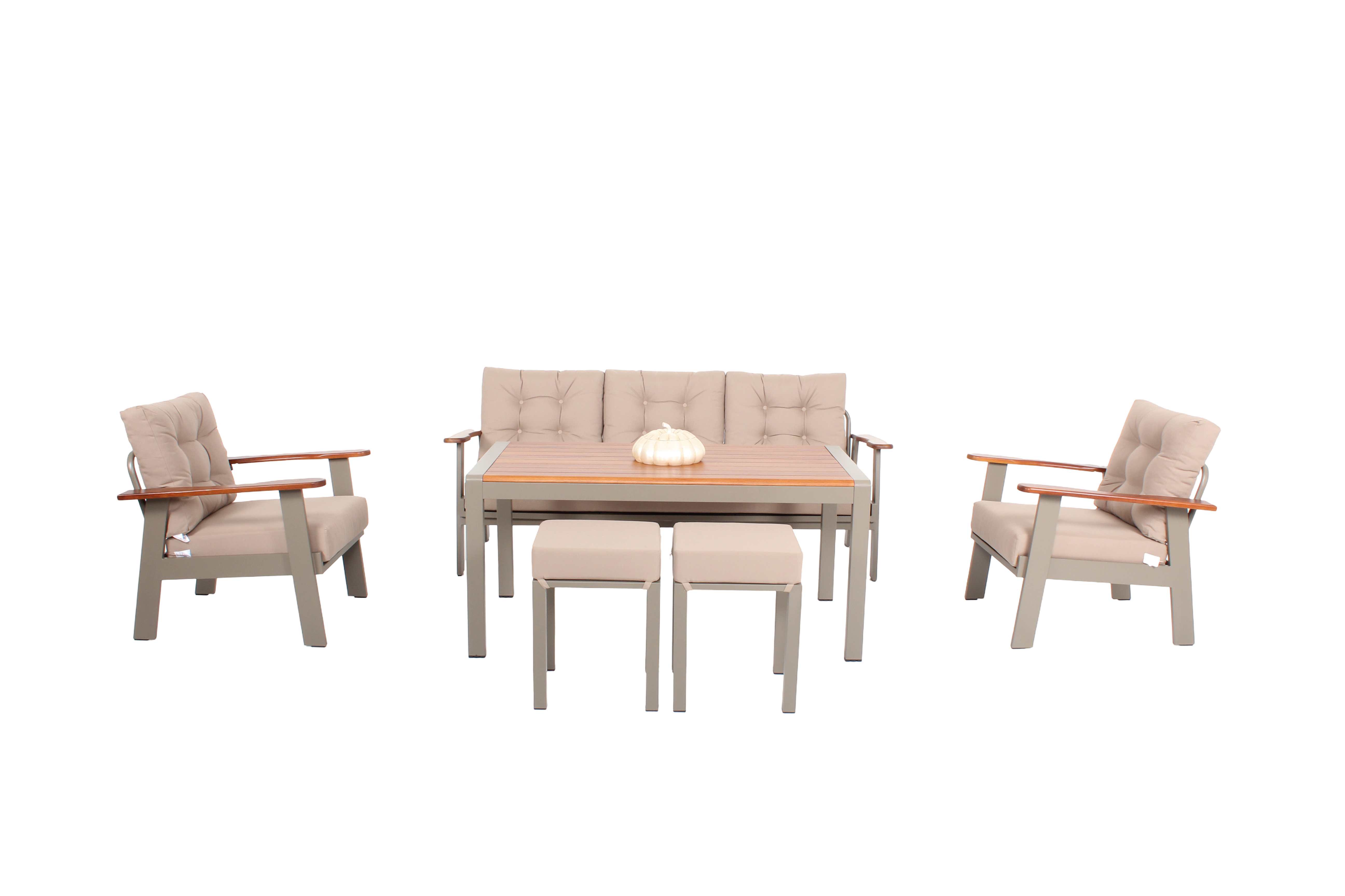 Oturma takımımız 1 adet üçlü koltuk, 2 adet tekli koltuk, 1 adet orta sehpa ve 2 adet puftan ibarettir. Görselde yer alan aksesuarlar ürün içeriğine dahil değildir. Kumaşlarımız su itici özelliğe sahip İspanyol dış mekan kumaşlarıdır. Minderlerimiz 36 dansite soft özelliğe sahiptir. Ürünümüzün profili alüminyumdur. Ürünümüzün oturum kısmı ithal fileden imal edilmiştir. Sehpa tablasında tüm hava koşullarına dayanıklı iroko malzeme kullanılmıştır.
