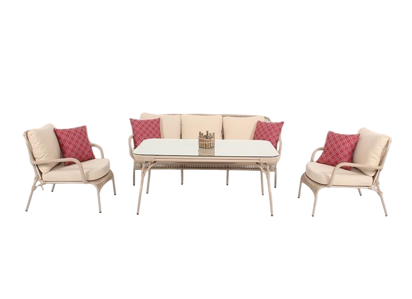 Oturma takımımız 1 adet üçlü koltuk 2 adet tekli koltuk ve 1 adet orta sehpadan ibarettir. Görselde yer alan aksesuarlar ürün içeriğine dahil değildir. Kumaşlarımız su itici özelliğe sahip dış mekan kumaşlarıdır. Ürünümüzün profili Alüminyumdur.
