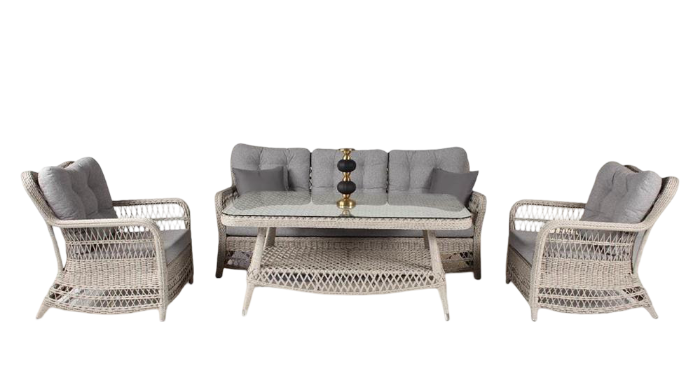Güneş ve suya dayanıklı yüksek kalite sentetik Rattan ile örülmüştür. El yapımı örgülüdür. Kumaş su itici ve kolayca temizlenebilen minderler ürüne dahildir. 4 sezonlu dış mekan kullanıma uygundur.
