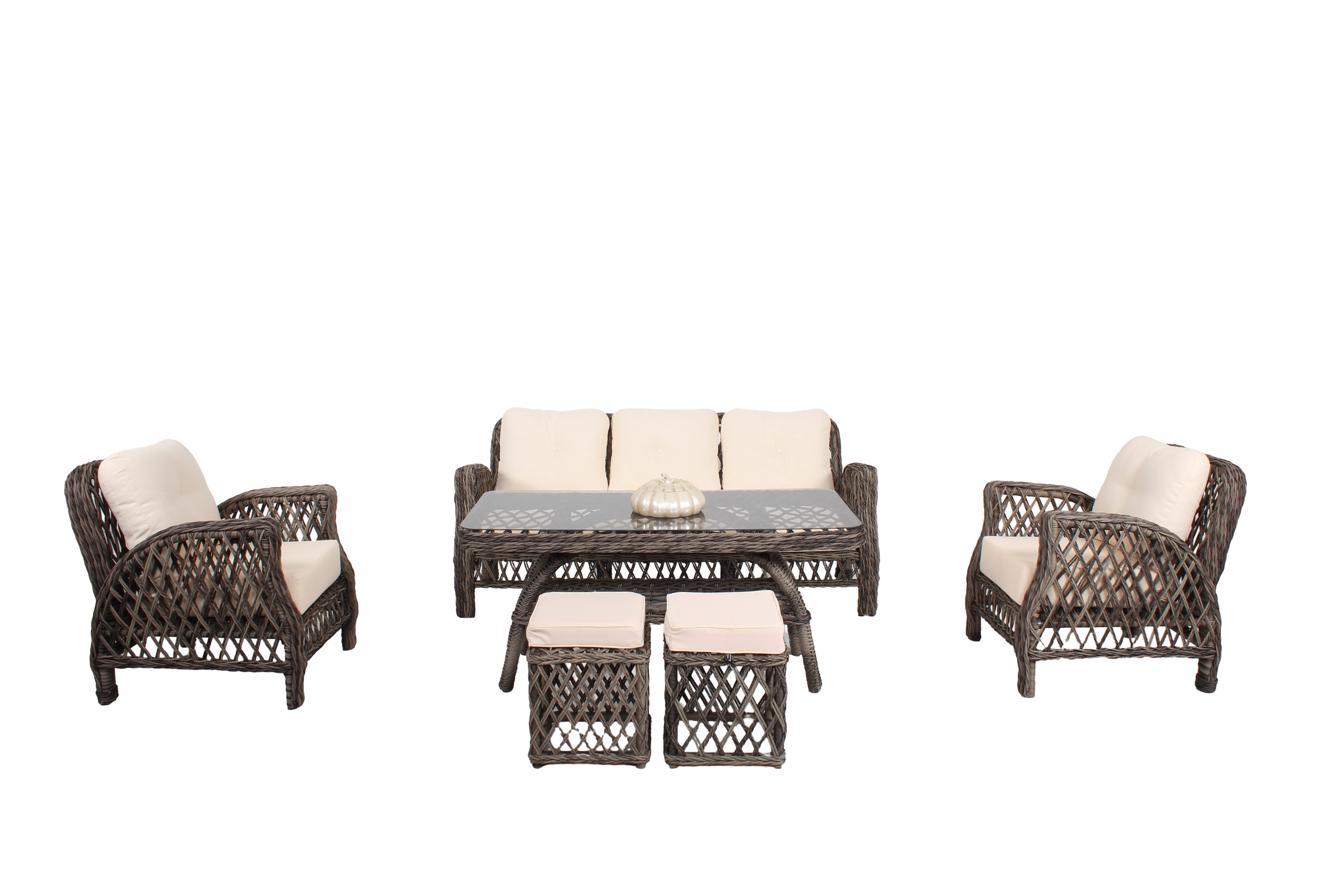Oturma grubu içeriği 1 adet üçlü koltuk 2 adet tekli koltuk 1 adet orta sehpa ve 2 adet puf olup minderler ürüne dahildir.