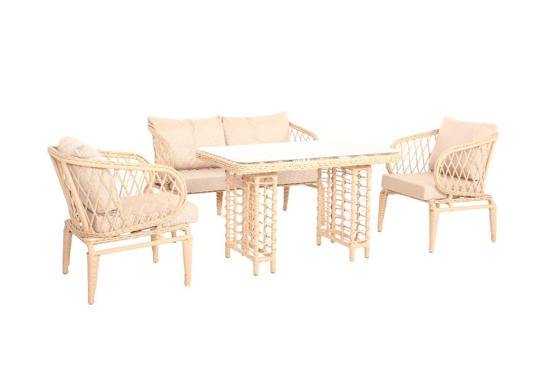 Balkon takımı 1 adet ikili koltuk 2 adet tekli koltuk 1 adet sehpadan oluşmaktadır ve minderler ürün içeriğine dahildir.