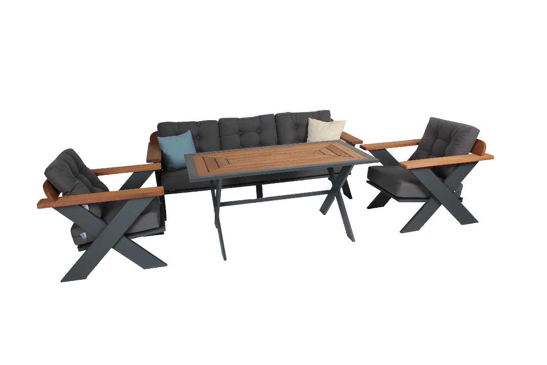 Oturma takımımız 1 adet üçlü koltuk 2 adet tekli koltuk ve 1 adet orta sehpadan ibarettir. Görselde yer alan aksesuarlar ürün içeriğine dahil değildir. Kumaşlarımız su itici özelliğe sahip dış mekan kumaşlarıdır. Ürünümüzün profili alüminyumdur. Sehpa tablası ve kolçaklarda yer alan ahşaplar iroko ağacıdır.