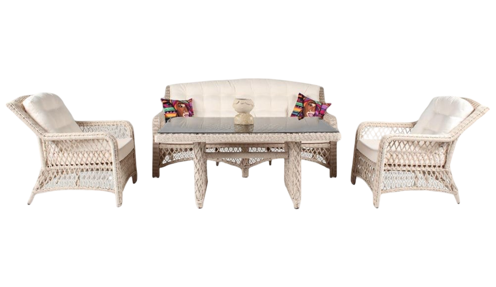 Güneş ve suya dayanıklı yüksek kalite sentetik Rattan ile örülmüştür. El yapımı örgülüdür. Kumaş su itici ve kolayca temizlenebilen minderler ürüne dahildir. 4 sezonlu dış mekan kullanıma uygundur.