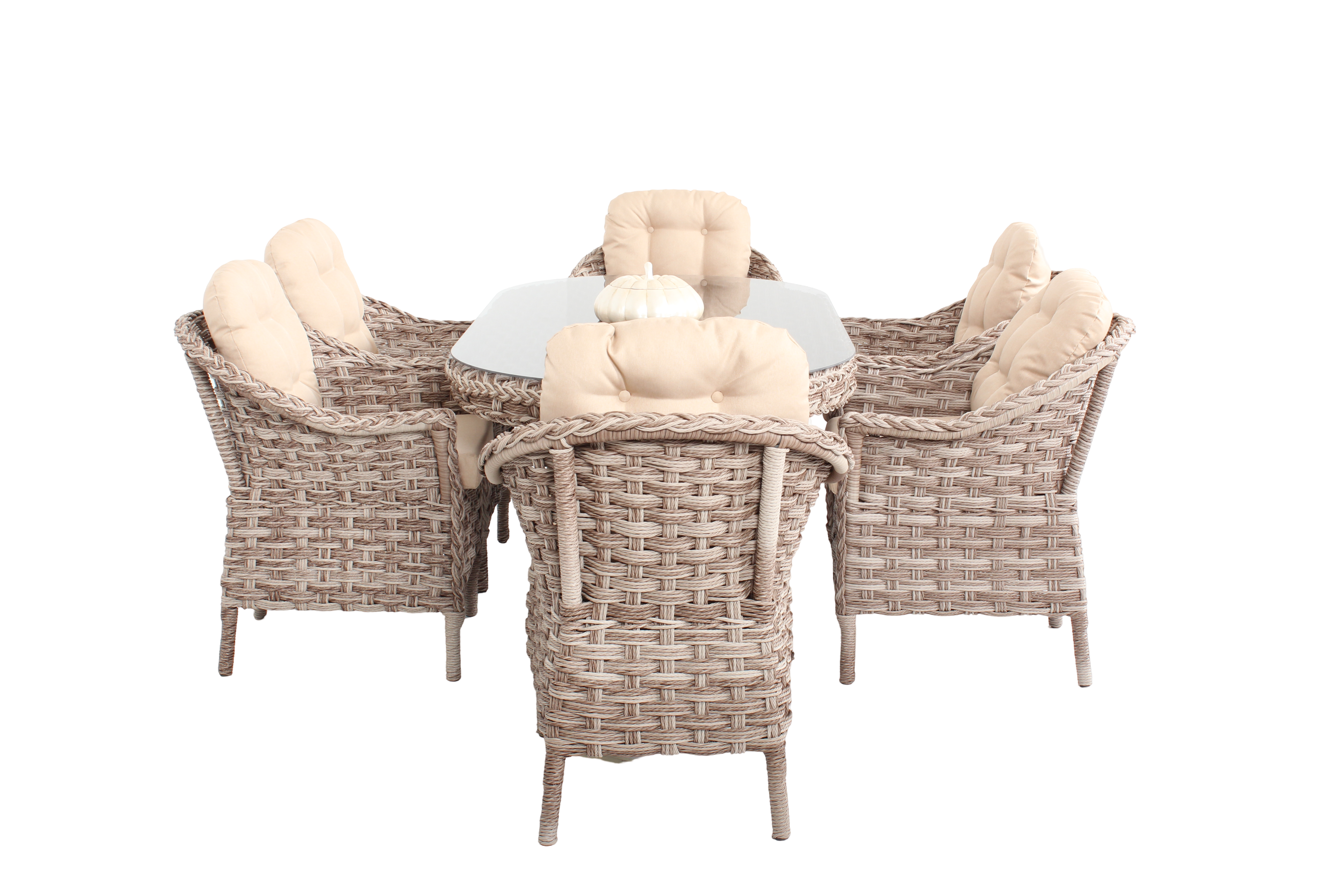 Güneş ve suya dayanıklı UV katkılı birinci sınıf sentetik Rattan ile elde örülmüştür. Sehpa üzerinde temperli cam bulunmaktadır. Kumaş su itici ve kolayca temizlenebilen minderler ürüne dahildir. Dış mekanda 4 sezonlu kullanıma uygundur. Görselde yer alan aksesuarlar ürün içeriğine dahil değildir.