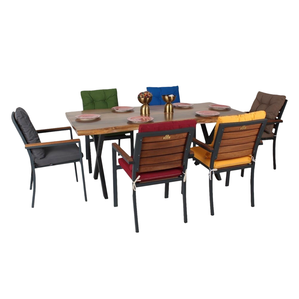 Güneş ve suya dayanıklı birinci sınıf Ceviz ağacından ve paslanmaz Alüminyum malzeme ile üretilmiştir. Kumaş su itici ve kolayca temizlenebilen minderler ürüne dahildir. 4 sezonlu dış mekan kullanıma uygundur. Görselde yer alan aksesuarlar ürün içeriğine dahil değildir.