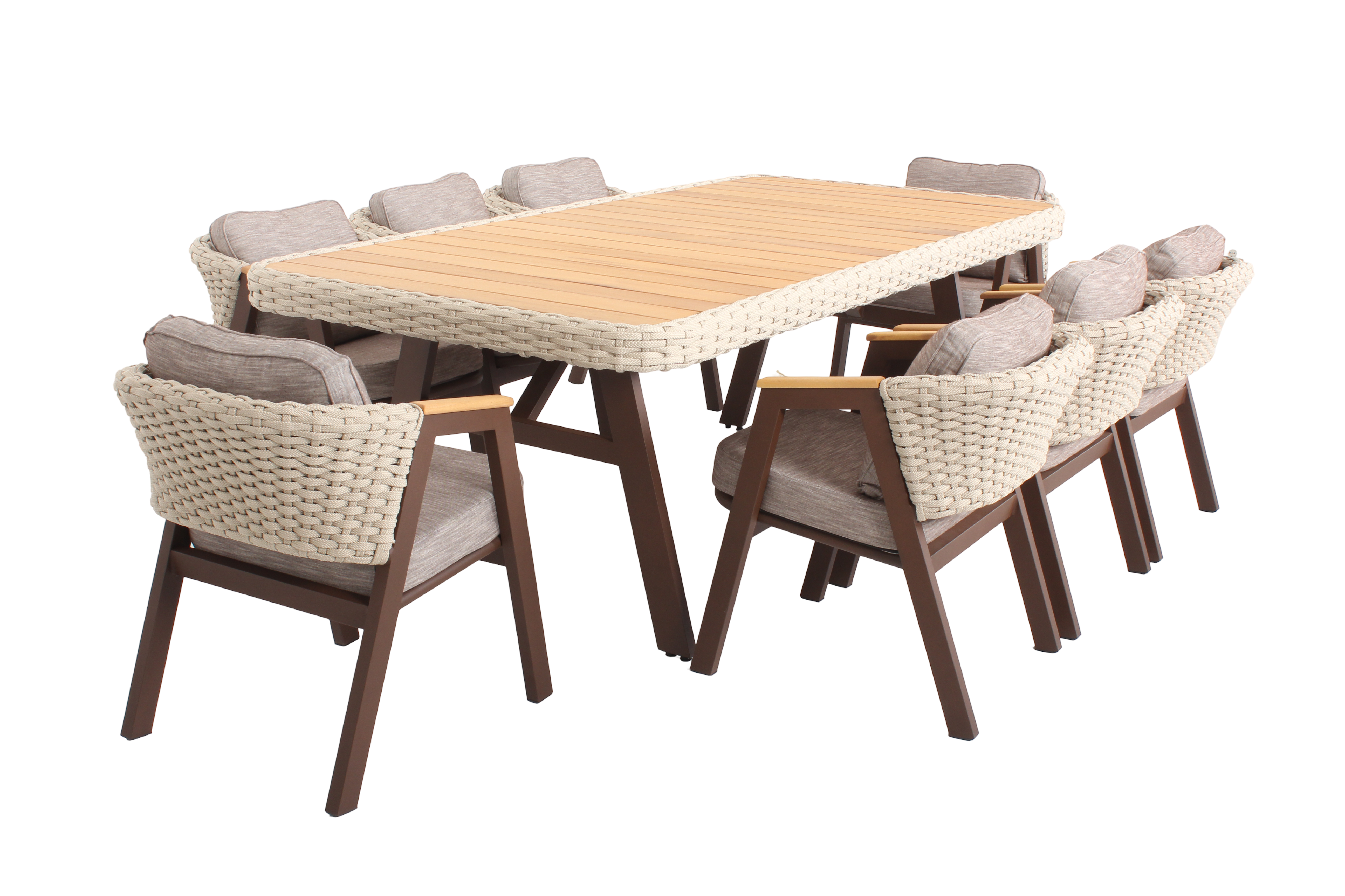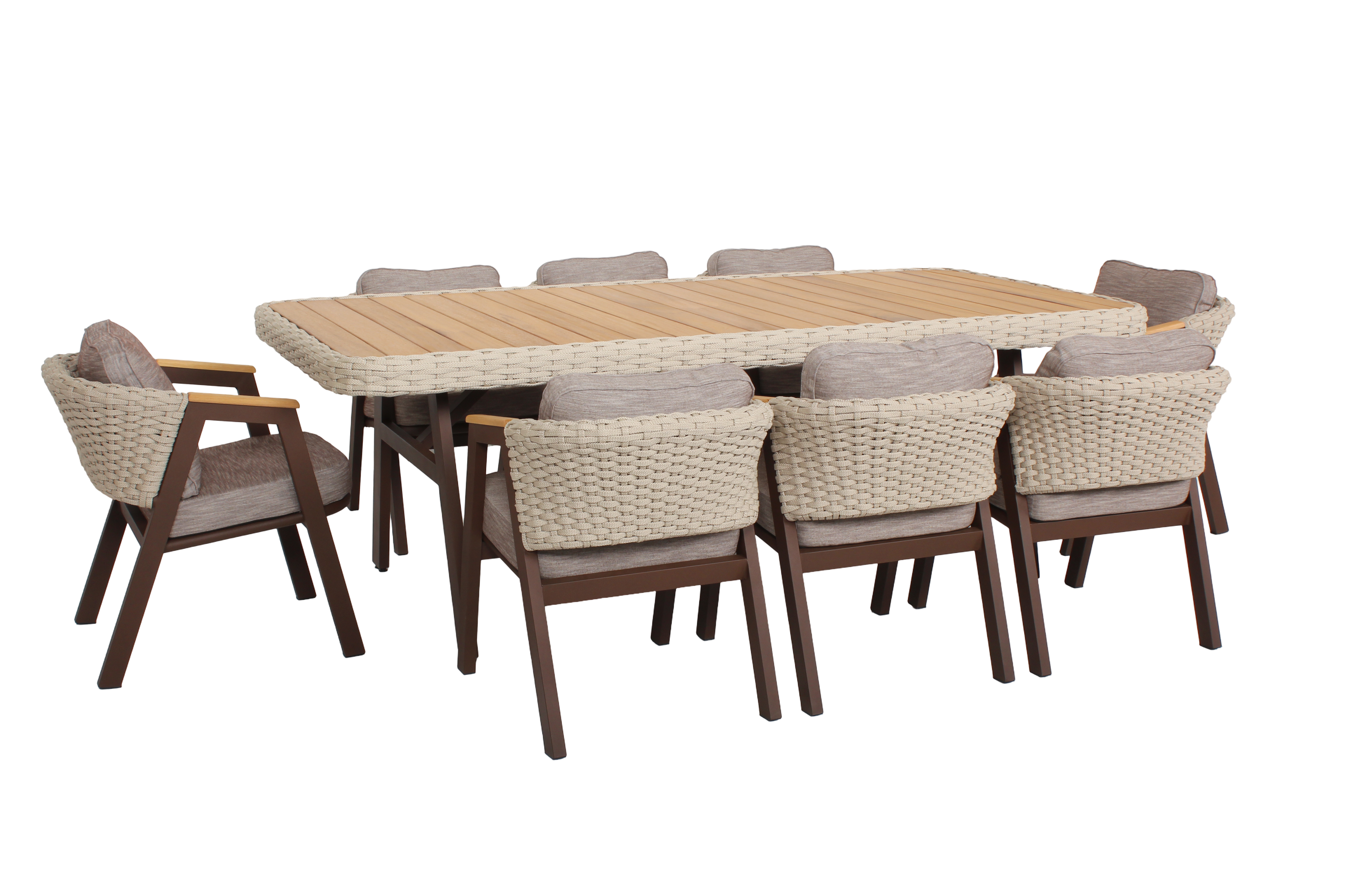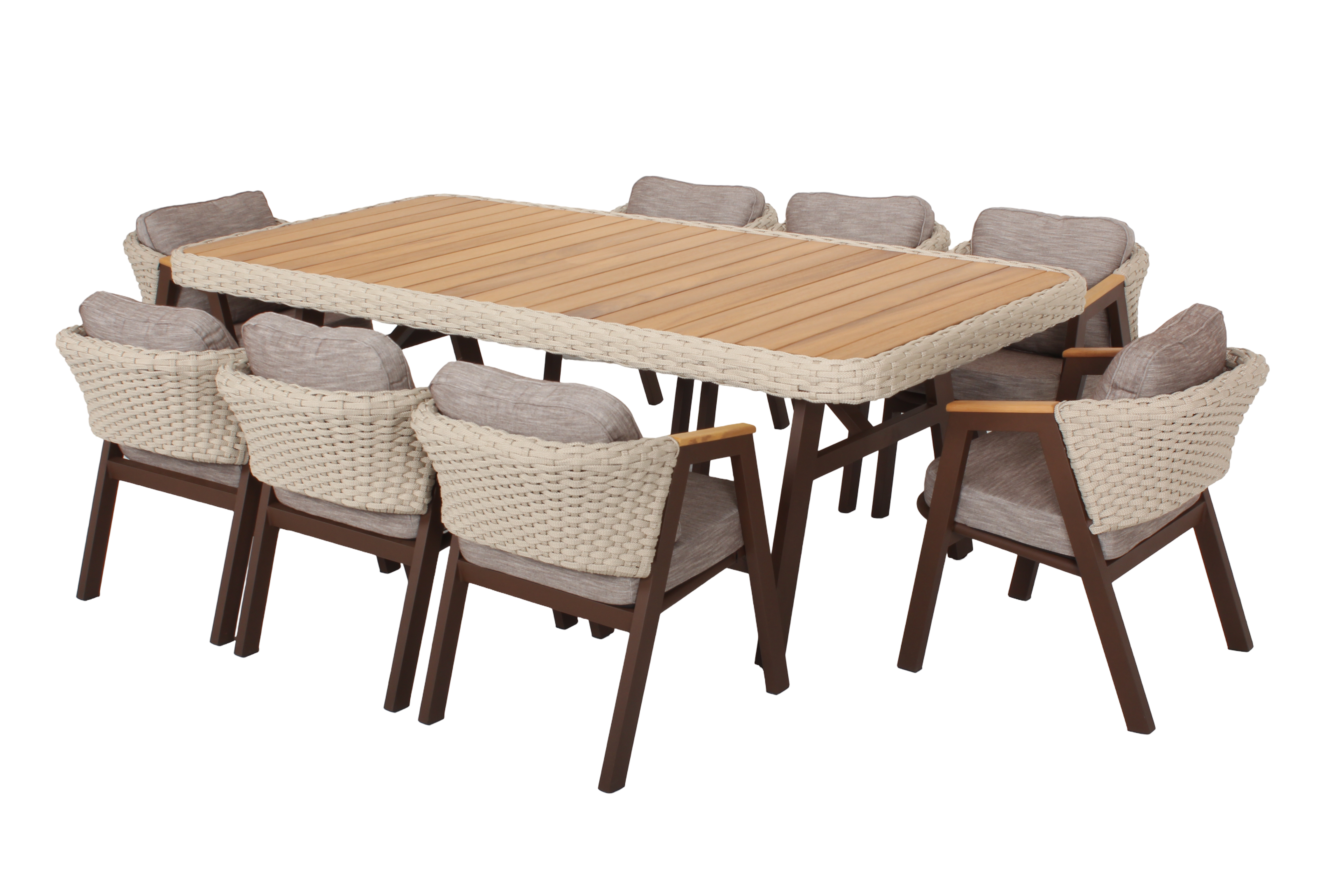 Masa takımı bir adet masa ve 8 sandalyeden ibarettir. Görselde yer alan aksesuarlar ürün içeriğine dahil değildir. Kumaşlarımız su itici özelliğe sahip dış mekan kumaşlarıdır. Ürünümüzün profili alüminyumdur. Dış mekan iplerden imal edilmiş olup sehpa tablasında tüm hava koşullarına dayanıklı iroko malzeme kullanılmıştır. Ölçüler (Uzunluk x En x Yükseklik CM) olarak: Sandalye: (Genişlik: 56) x (Derinlik: 68) x (Yükseklik:72) Masa: (Uzunluk:230) x (En: 110) x (Yükseklik:77)