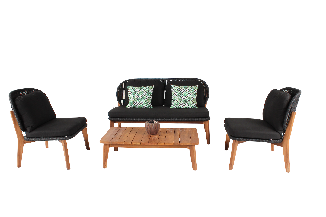 Oturma takımımız 1 adet ikili koltuk 2 adet tekli koltuk ve 1 adet orta sehpadan ibarettir. Görselde yer alan aksesuarlar ürün içeriğine dahil değildir. Kumaşlarımız su itici özelliğe sahip dış mekan kumaşlarıdır. Ürünümüzün profili ve sehpasında yer alan ahşaplar İroko ağacıdır. dış mekan iplerden imal edilmiştir.