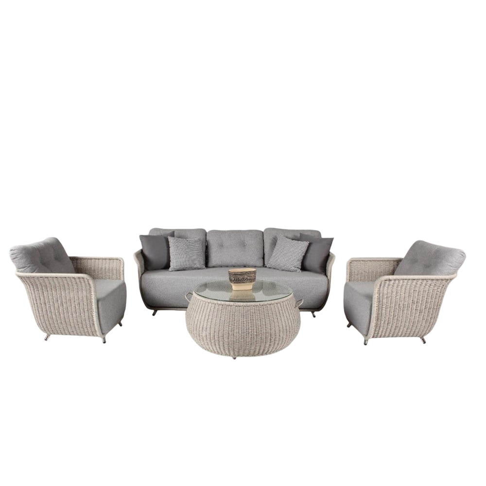 Güneş ve suya dayanıklı yüksek kalite sentetik Rattan ile örülmüştür. El yapımı örgülüdür. Kumaş su itici ve kolayca temizlenebilen minderler ürüne dahildir. 4 sezonlu dış mekan kullanıma uygundur.
